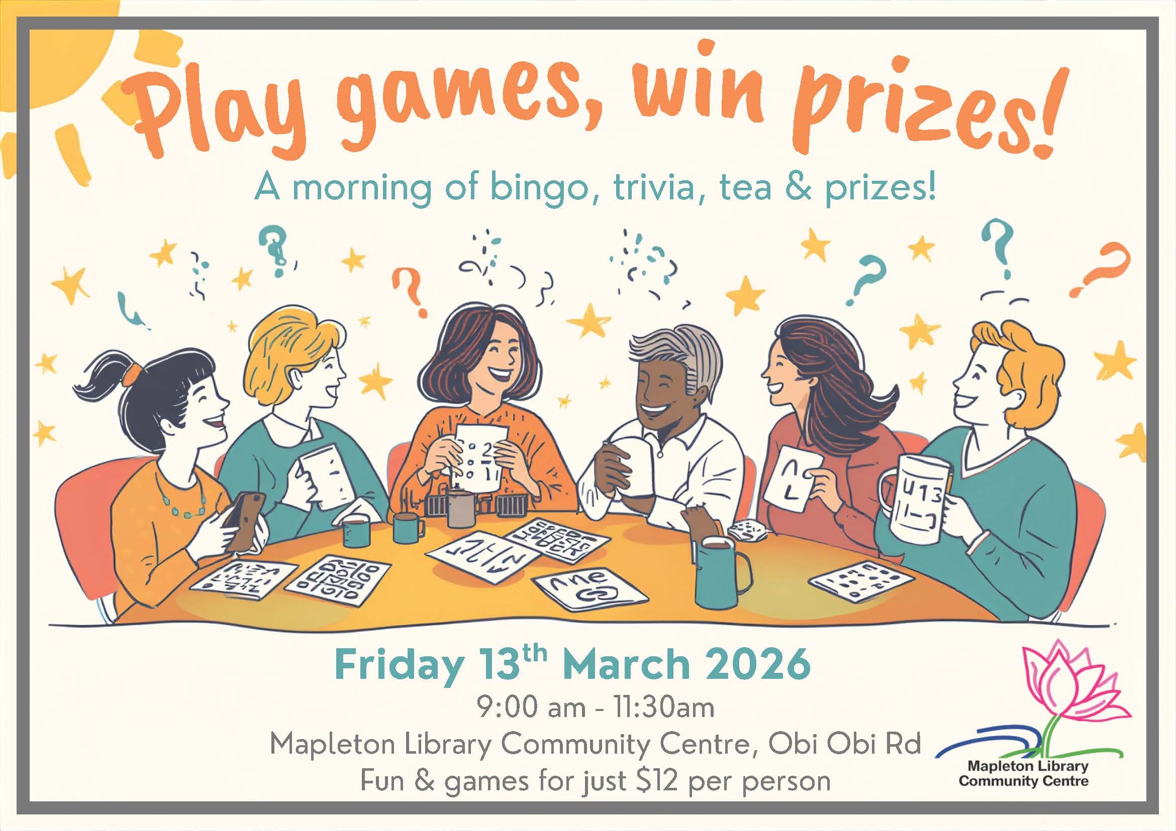 Bingo, Trivia and Tea+ Add to Google Calendar+ iCal / Outlook export 00days 00hours 00minutes 00seconds DateMar 13 2026 Time 9:00 am - 11:30 am Cost12.00 LocationMapleton Library & Community CentreObi Obi Road, Mapleton, QLDShare this event SearchSearchRecent PostsRecent CommentsNo comments to show.ArchivesNo archives to show.CategoriesNo categories